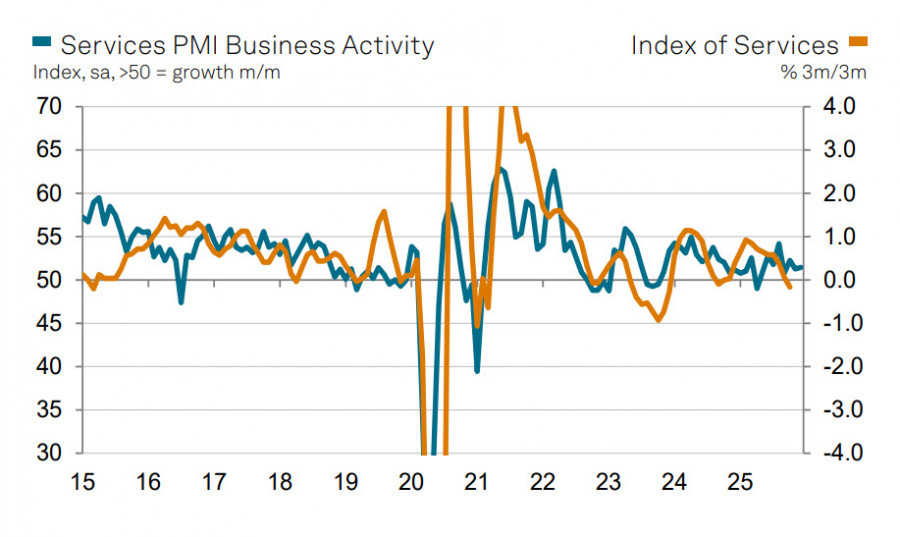 لا يُتوقع حدوث مفاجآت كبيرة. استمرت مؤشرات PMI في الارتفاع للشهر السابع على التوالي في نوفمبر. وعلى الرغم من تباطؤ زخم النمو قليلاً في ديسمبر، إلا أن المؤشرات ظلت في المنطقة الإيجابية. ومن الجانب الإيجابي، استأنفت الطلبات الجديدة في قطاع الخدمات النمو، مما أضفى مرونة على الاقتصاد. في الوقت نفسه، استمر التراجع في التوظيف للشهر الخامس عشر على التوالي، وهو ما لا يتماشى تمامًا مع الزيادة العامة في نشاط القطاع. ومن الاتجاهات البارزة الأخرى هو زيادة الضغط على الأجور المتوسطة، مما ينبغي أن يساعد في تقليل التضخم المرتفع بشكل مستمر مع مرور الوقت. وعلى العكس، فإن الزيادة الحادة في التكاليف في ديسمبر تدعم الضغوط التضخمية.