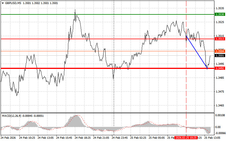 السيناريو رقم 1: اليوم، أخطط لبيع الجنيه بعد اختراق هبوطي لمستوى 1.3490 (الخط الأحمر على الرسم البياني)، ما سيؤدي إلى هبوط سريع للزوج. الهدف الرئيسي للبائعين سيكون عند 1.3472، حيث سأغلق مراكز البيع وأفتح فورًا مراكز شراء في الاتجاه المعاكس (مستهدفًا حركة مقدارها 20–25 نقطة في الاتجاه المعاكس من ذلك المستوى). سيعود الضغط على الجنيه اليوم في حال صدور تعليقات hawkish وعدم وجود إشارات تدل على خفض أسعار الفائدة. مهم! قبل البيع، تأكد من أن مؤشر MACD أسفل مستوى الصفر وقد بدأ للتو في التراجع منه.