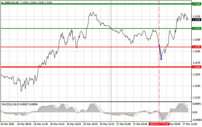 تم اختبار مستوى 1.3290 في الوقت الذي كان فيه مؤشر MACD يبدأ بالكاد في التحرك هبوطًا من خط الصفر، وهو ما أكد نقطة دخول صحيحة لصفقة بيع على الجنيه الإسترليني. ومع ذلك، لم يستمر الزوج في تسجيل هبوط ملحوظ بعد ذلك.