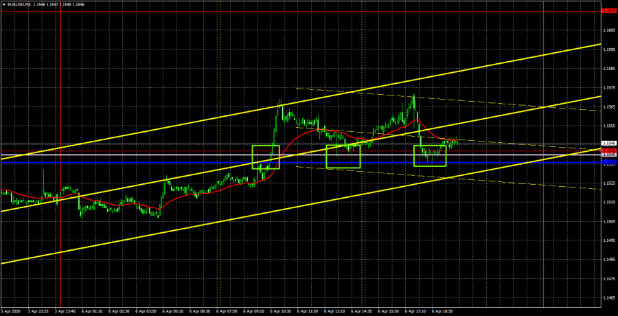 على الرسم البياني للإطار الزمني 5 دقائق يوم الاثنين، تكوّنت ثلاثة إشارات تداول في نطاق 1.1536–1.1542. في الحالتين الأوليين، تحرك الزوج في الاتجاه المطلوب بنحو 20 نقطة، لكن اتضح أن كلتا الإشارتين كانتا زائفتين. وبذلك لم يتكبد المتداولون خسائر بسببهما، ولذلك لم يكن من المفترض الدخول في الصفقة اعتماداً على الإشارة الثالثة المماثلة في المنطقة نفسها.