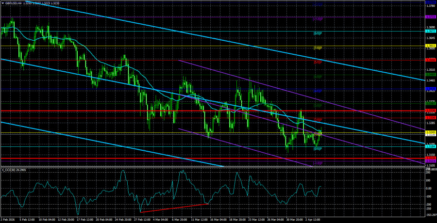 متوسط التذبذب اليومي لزوج GBP/USD خلال آخر 5 أيام تداول بلغ 101 نقطة أساس (pips)، وهو ما يُعد "متوسطًا". يوم الثلاثاء 7 أبريل، نتوقع أن يتحرك الزوج ضمن نطاق بين 1.3134 و1.3336. القناة العلوية للانحدار الخطي انعكست إلى الأسفل، مما يشير إلى تغير في الاتجاه. مؤشر CCI دخل منطقة التشبع البيعي مرتين وشكّل دايفرجنس "صعودي"، وهو ما يُحذّر مرة أخرى من احتمال اكتمال الاتجاه الهابط. مع ذلك، تبقى العوامل الجيوسياسية حاليًا أكثر أهمية من الإشارات الفنية.