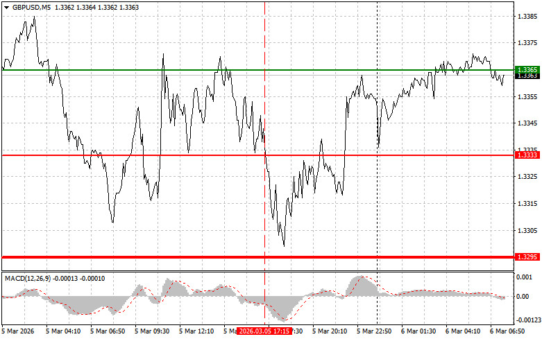পরিকল্পনা 1: আজ পাউন্ডের মূল্য 1.3353-এর (চার্টে লাল লাইন) লেভেলে পৌঁছানোর পর আমি পাউন্ড বিক্রি করার পরিকল্পনা করছি, যা GBP/USD-এর দ্রুত দরপতনের দিকে নিয়ে যাবে। বিক্রেতাদের জন্য মূল লক্ষ্যমাত্রা হবে 1.3320-এর লেভেল, যেখানে মূল্য পৌঁছালে আমি শর্ট পজিশন ক্লোজ করতে যাচ্ছি এবং অবিলম্বে বিপরীত দিকে লং পজিশন ওপেন করার পরিকল্পনা করছি, এই লেভেল থেকে বিপরীত দিকে 20-25 পিপস মুভমেন্ট হওয়ার আশা করছি। আজ যেকোনো মুহূর্তে পাউন্ডের বিক্রেতাদের সক্রিয় হওয়ার সম্ভাবনা রয়েছে। গুরুত্বপূর্ণ! বিক্রি করার আগে, নিশ্চিত করুন যে MACD সূচকটি শূন্যের নিচে রয়েছে এবং শূন্যের নিচে নামতে শুরু করেছে।