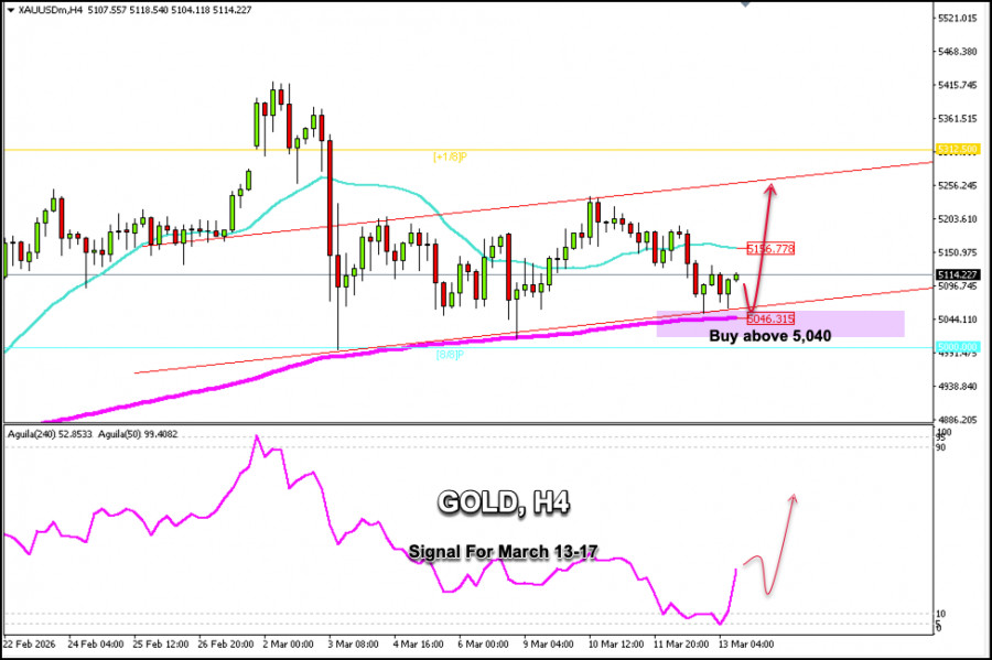 В случай че в следващите часове се наблюдава техническа корекция към долната граница на възходящия канал около $5 060 или към 200-дневната пълзяща средна около $5 046, това може да се разглежда като сигнал за откриване на дълги позиции с цели около $5 156. Металът дори би могъл да достигне краткосрочната линия +1/8 Murray около $5 312.