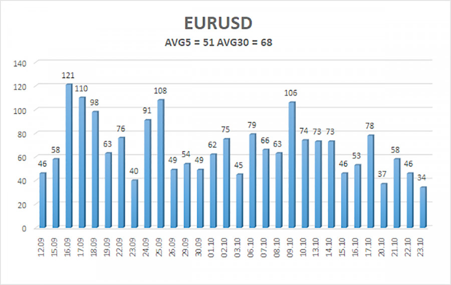 Средната волатилност на двойката EUR/USD за последните пет търговски дни (към 24 октомври) е 51 пипса, което се класифицира като "средна." В петък очакваме движение на цената между 1.1559 и 1.1661. Горният линеен регресионен канал е насочен нагоре, което продължава да посочва възходящ тренд. Освен това, CCI индикаторът е навлязъл в зоната на презапродаденост, което потенциално сигнализира за ново възходящо движение.