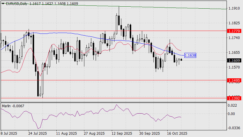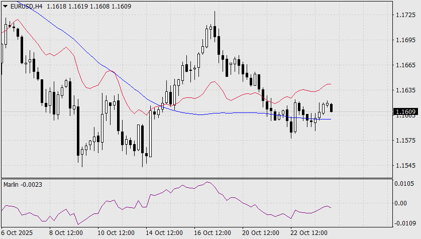 С очакванията Федералният резерв да намали лихвените проценти следващата седмица — текущо оценяващо се с 97% вероятност — пазарният оптимизъм е оправдан. Краткосрочната цел нагоре остава 1.1779, върхът, регистриран както на 9 септември, така и на 1 октомври. Ако цената успешно се затвори над линията на MACD, осцилаторът Marlin може да премине в положителна територия, като допълнително засили бичия сценарий.