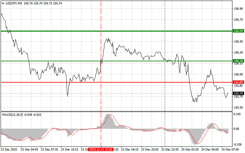 Сценарий № 1: Планирам да купя USD/JPY днес след достигане на входна точка около 155.87 (зелена линия на графиката), с цел повишение до 156.29 (по-дебела зелена линия на графиката). Около 156.29 възнамерявам да закрия дългите позиции и да отворя къси позиции в обратна посока (очаквайки движение от 30-35 пипса в обратна посока от нивото). Най-добре е да се възобнови купуването на двойката по време на корекции и сериозни възвратни движения на USD/JPY. Важно! Преди да купите, уверете се, че MACD индикаторът е над нулевата линия и току-що започва да се издига от нея.