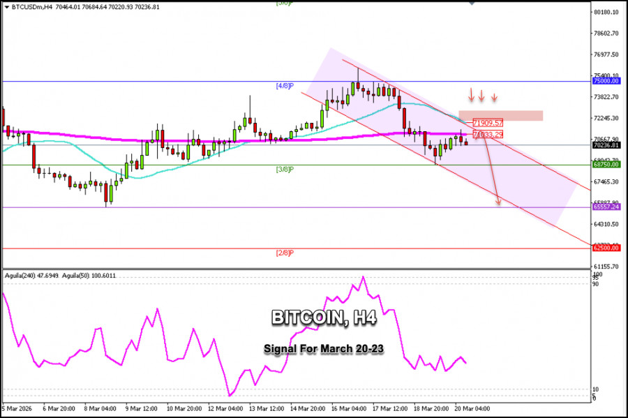 Eagle 指標正發出看空信號,因此,如果價格向上回調至下降通道上軌附近的 71,500 美元一帶,可視為建立空頭倉位的信號,目標看向 68,500 美元,甚至預期 BTC 可能跌至約 62,500 美元的 2/8 Murray 水平。