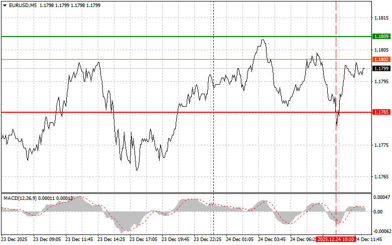 情境1:今天,如果價格達到1.1809水平(圖表中的綠線),可以考慮買入歐元,目標上升至1.1855。在1.1855水平,我計劃退出市場並向相反方向出售歐元,預期從進入點移動30–35點。若美國數據疲弱,則預期歐元將在趨勢中強勁上升。重要!在買入前,請確保MACD指標位於零線上方並剛開始從零線上升。