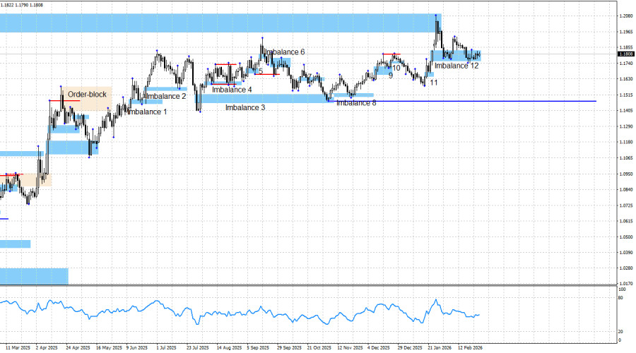 我再提醒一次,價格已第二次進入「看漲」失衡區 12,這讓人有理由期待第二次反應,並延續先前的多頭走勢。不過,從過去七天來看,可以得出什麼結論呢?這段時間內,價格始終停留在失衡區內,既沒有表現出形成買入訊號的意圖,也沒有顯示要直接否定該失衡區的跡象。因此,EUR/USD 依然處於一種「懸而未決」的狀態。如果這個失衡最終被否定,空頭在一段時間內會掌握主動,不過整體的大級別多頭趨勢仍將維持不變。相反地,如果從失衡區 12 出現反應,上漲走勢將會恢復,而在目前情況下,我認為這才是邏輯上最合理的情境。