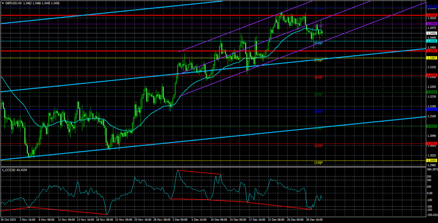 Die durchschnittliche Volatilität des GBP/USD-Paares in den letzten fünf Handelstagen beträgt 64 Pips. Für das Pfund/Dollar wird dieser Wert als "mittel-niedrig" angesehen. Daher erwarten wir am Montag, dem 5. Januar, Bewegungen innerhalb einer Spanne von 1,3392 bis 1,3520. Der höhere lineare Regressionstrendkanal hat nach oben gedreht, was auf eine Erholung des Trends hindeutet. Der CCI-Indikator ist in den vergangenen Monaten sechs Mal in den überverkauften Bereich eingetreten und hat zahlreiche "bullishe" Divergenzen gebildet, die Händler wiederholt vor der Fortsetzung des Aufwärtstrends warnten.