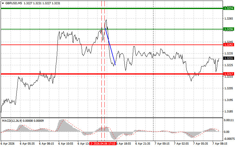 Le test du prix à 1,3256 s’est produit au moment où l’indicateur MACD avait nettement dépassé la ligne zéro, ce qui a limité le potentiel haussier de la paire. Le deuxième test à 1,3256 a coïncidé avec un MACD en zone de surachat, permettant la mise en œuvre du scénario n°2 : la vente de la livre, qui a entraîné une baisse de plus de 30 pips.