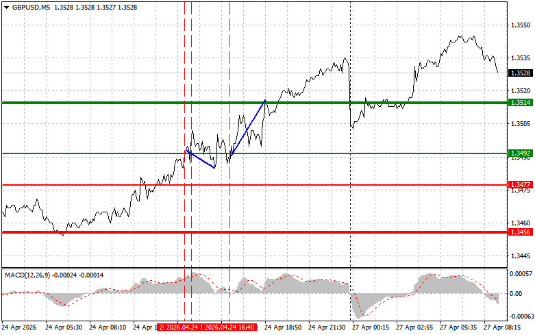 Le test du prix à 1,3492 a coïncidé avec le moment où l’indicateur MACD commençait tout juste à se déplacer à la hausse depuis la ligne zéro, ce qui en a fait un bon point d’entrée pour l’achat de la livre. En conséquence, la paire est montée jusqu’au niveau cible de 1,3514.