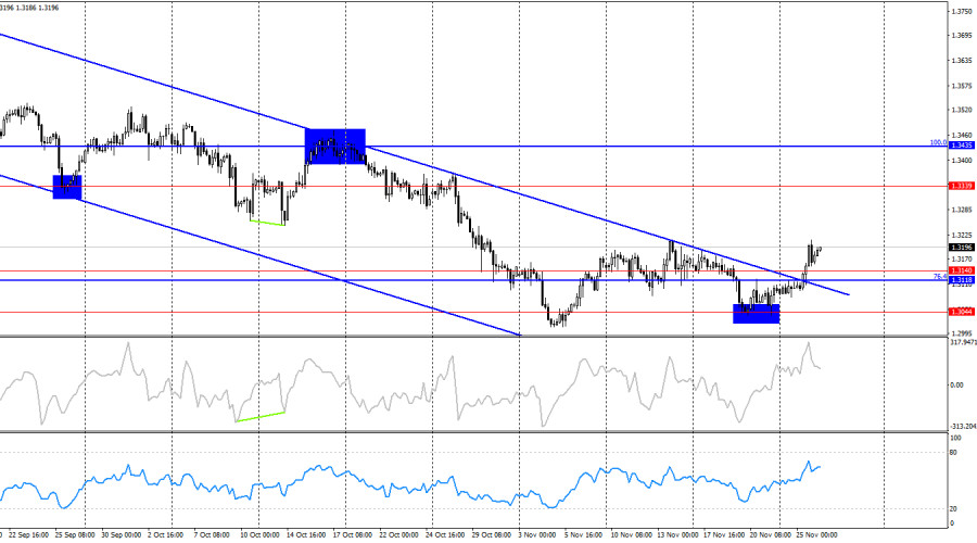 Pada grafik per jam, pasangan GBP/USD pada hari Selasa terkonsolidasi di atas level resistensi 1.3119–1.3139 dan naik menuju level resistensi 1.3186–1.3214. Pemantulan dari zona ini—terutama dari level 1.3214—akan menguntungkan mata uang AS dan menyebabkan penurunan menuju level 1.3119–1.3139. Konsolidasi pasangan di atas level 1.3186–1.3214 akan meningkatkan kemungkinan pertumbuhan lebih lanjut menuju 1.3240 dan 1.3294.