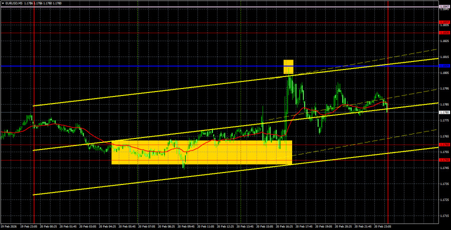 The EUR/USD currency pair rose slightly on Friday, but numerous events throughout the day kept volatility quite weak once again. It seems the market has not fully figured out what to do with all the information received, as the pair began to swing rapidly up and down in the second half of the day. Recall that on Friday, decent reports on business activity were published in the Eurozone. In Germany, solid reports on business activity were released. In the US, the main report of the day—the fourth-quarter GDP—significantly underperformed, coming in at half the forecast. And at the end of the day and the week, the US Supreme Court pleased traders by declaring Donald Trump's tariffs illegal, while Trump immediately imposed new tariffs, raising them to 15% the following day. With so much information, traders' heads are likely spinning.