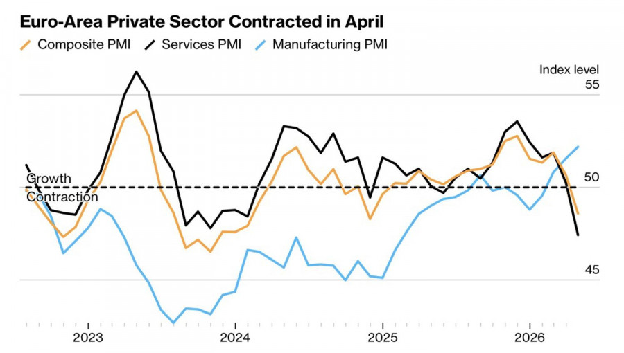The oil crisis is not as alarming as its consequences, and these are already being felt, judging by the dynamics of purchasing managers' indices. The situation is worse in the eurozone, where business activity in April fell below the critical 50 mark. This signals a slowdown in economic growth. The services sector struggled the most, while the manufacturing sector battled on. A similar situation was observed in Germany. The EUR/USD declined, but a collapse is still far off.