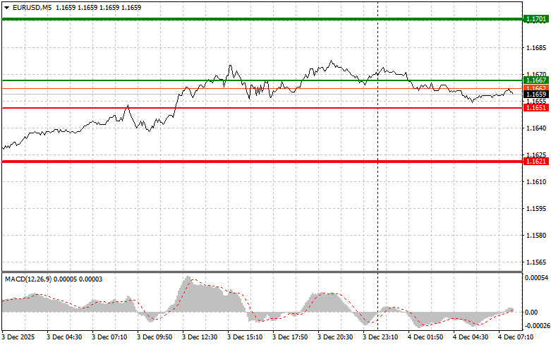 Planuję kupić euro, gdy cena dotrze do poziomu 1,1667 (zielona linia na wykresie) i zrealizować zysk na poziomie 1,1701 (zielona linia pogrubiona na wykresie). W pobliżu 1,1701 zamierzam zamknąć pozycje długie i zająć krótkie, zakładając, że para przesunie się o 30-35 punktów w przeciwnym kierunku. Dziś euro może zyskać na wartości tylko po publikacji pozytywnych danych. Kupując, upewnij się jednak, że linia MACD znajduje się powyżej poziomu zera lub dopiero zaczyna rosnąć.