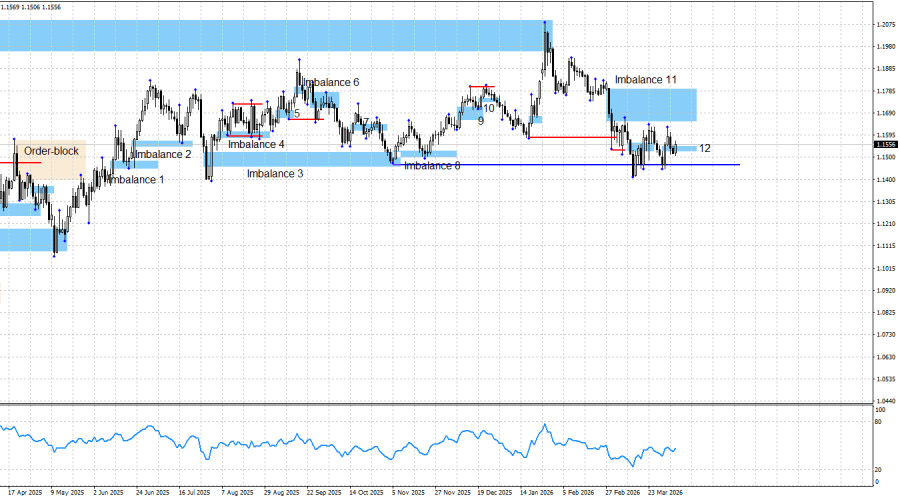 Em segundo lugar, hoje o preço pode reagir ao Imbalance 12, formando assim um sinal de compra dentro de uma tendência de alta. Outro ponto importante são as potenciais varreduras de liquidez das últimas duas oscilações de alta, que podem coincidir com o teste do Imbalance 11. Portanto, ainda é cedo para afirmar que os compradores estão iniciando uma ofensiva em larga escala, mas essa probabilidade existe. A condição-chave é que se alcance um cessar-fogo entre Washington e Teerã.