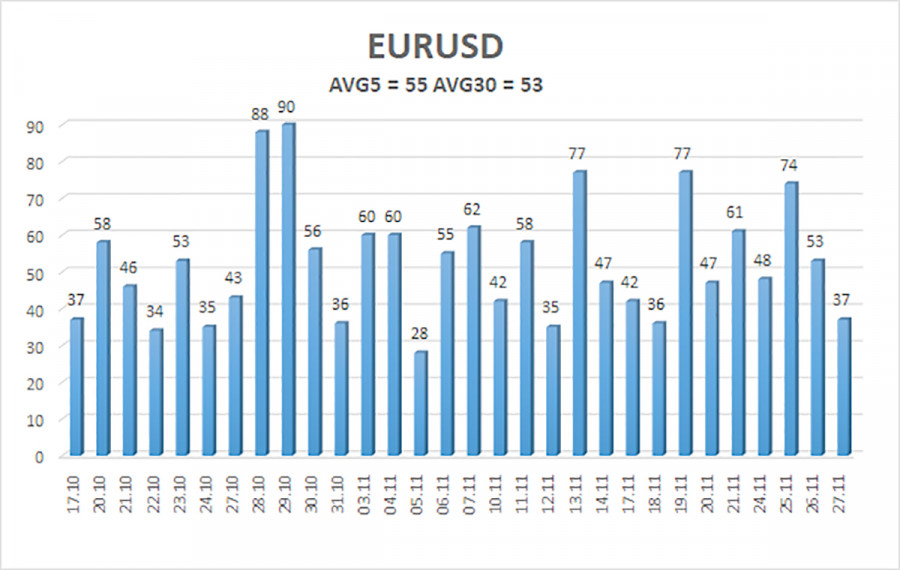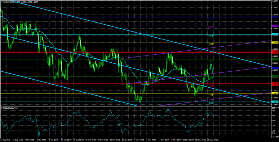 Средняя волатильность валютной пары EUR/USD за последние 5 торговых дней по состоянию на 28 ноября составляет 55 пунктов и характеризуется, как «средняя». Мы ожидаем движение пары между уровнями 1,1542 и 1,1652 в пятницу. Старший канал линейной регрессии направлен вниз, сигнализируя о нисходящей тенденции, но по факту продолжается флэт на дневном ТФ. Индикатор CCI заходил в октябре в область перепроданности дважды(!!!), что может спровоцировать новый виток восходящего тренда 2025 года.