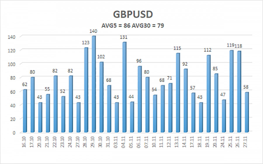 Средняя волатильность пары GBP/USD за последние 5 торговых дней составляет 86 пунктов. Для пары фунт/доллар это значение является «средним». В пятницу, 28 ноября, таким образом, мы ожидаем движения внутри диапазона, ограниченного уровнями 1,3154 и 1,3326. Старший канал линейной регрессии направлен вниз, но только из-за технической коррекции на старших ТФ. Индикатор CCI шесть раз заходил в область перепроданности за последние месяцы и сформировал очередную «бычью» дивергенцию.