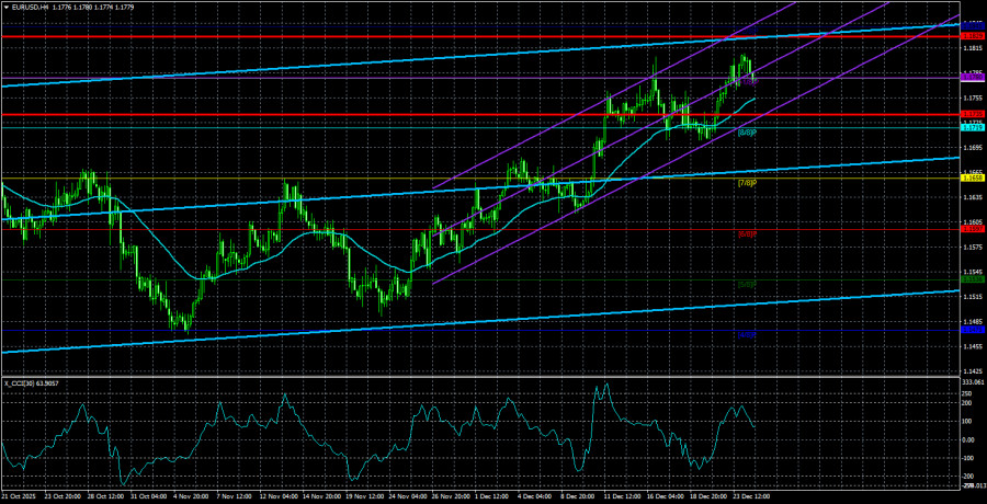 Валютная пара EUR/USD в течение четверга не показала никаких движений, потому что валютный рынок был закрыт. Однако выходной день – не повод расслабляться, а повод – провести глубокий анализ. Тем более, что новый год наступит уже через неделю и было бы не лишним понять, чего ожидать от него. На первый взгляд, все ясно, как божий день. В техническом плане на дневном ТФ пара продолжает находиться в боковом канале 1,1400-1,1830 уже шесть месяцев. В последние несколько недель цена поджимается к верхней границе, и мы практически уверены, что ее преодоление случится в самом ближайшем будущем. В этом случае глобальный восходящий тренд, который начался в январе 2025 года(а можно сказать, что в 2022 году), возобновится. Напомним, что за шесть месяцев доллар сумел скорректироваться на 23,6% по Фибоначчи. То есть коррекции, по сути, и не было. Таким образом, если нет коррекции, значит должен возобновиться тренд.