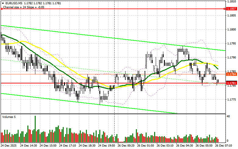 В среду так и не было образовано точек входа в рынок. Давайте посмотрим на 5-минутный график и разберемся с тем, что там произошло. В своем утреннем прогнозе я обращал внимание на уровень 1.1775 и планировал от него принимать решения по входу в рынок. Снижение евро произошло, но до теста 1.1775 дело так и не дошло. Во второй половине дня история повторилась уже с уровнем 1.1781.