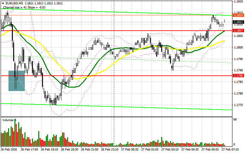 Вчера была образована лишь одна точка входа в рынок. Давайте посмотрим на 5-минутный график и разберемся с тем, что там произошло. В своем утреннем прогнозе я обращал внимание на уровень 1.1807 и планировал от него принимать решения по входу в рынок. Снижение в район 1.1807 прошло без образования точки входа на продажу евро, так что в первой половине дня войти в рынок не удалось. В ходе американской сессии ложный пробой в области 1.1788 привел к покупкам евро, но после восстановления на 12 пунктов давление на пару вернулось.