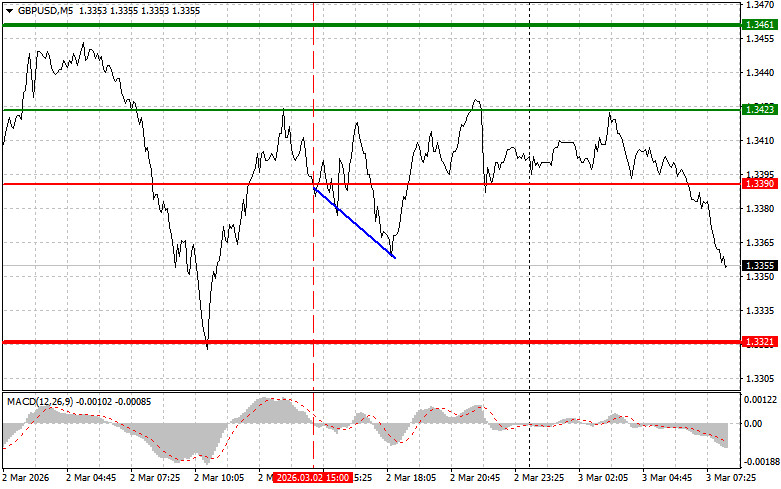 যখন MACD সূচকটি সবেমাত্র শূন্যের নিচে নামতে শুরু করছিল তখন এই পেয়ারের মূল্য 1.3390-এর লেভেল টেস্ট করেছিল, যা পাউন্ড বিক্রির জন্য সঠিক এন্ট্রি পয়েন্ট নিশ্চিত করেছিল। ফলস্বরূপ, এই পেয়ারের মূল্য 25 পিপস কমেছে।