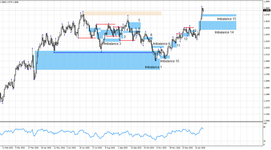 Da der Aufwärtstrend unbestreitbar ist, haben Händler nur eine Option: aufwärts zu handeln, mit klaren Mustern und klaren Signalen. In naher Zukunft könnten Händler eine Rückkehr der Preise in Ungleichgewicht 14 oder zumindest Ungleichgewicht 15 erwarten, gefolgt von der Bildung eines neuen bullishen Signals. Als Ziel für potenzielles Wachstum hatte ich zuvor das Niveau von 1,3725 in Betracht gezogen; dieses Niveau wurde erreicht, aber das Pfund könnte im Jahr 2026 noch viel höher steigen—vor allem angesichts der Ereignisse des ersten Monats des Jahres. Wenn bärische Muster entstehen, könnten auch Short-Positionen in Betracht gezogen werden, aber im Aufwärtstrend bevorzuge ich weiterhin den Kauf statt des Verkaufs.