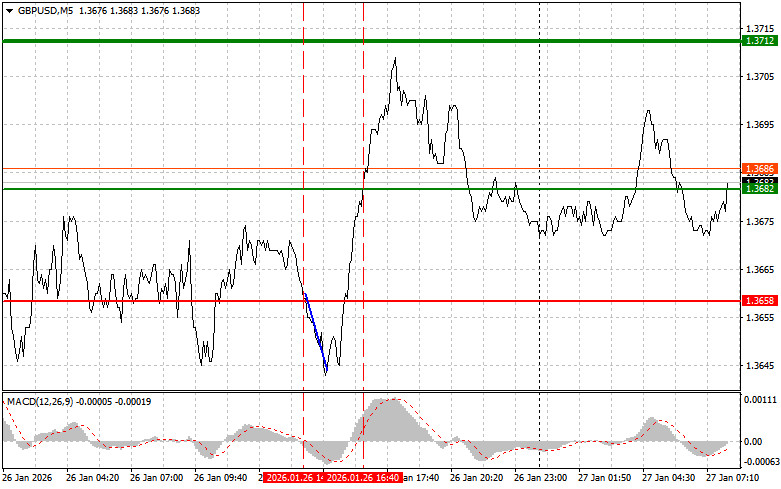 Ujian harga pada 1.3682 berlaku apabila penunjuk MACD bergerak jauh di atas paras sifar, yang mengehadkan potensi kenaikan pasangan mata wang itu. Oleh itu, saya tidak membeli pound sterling.