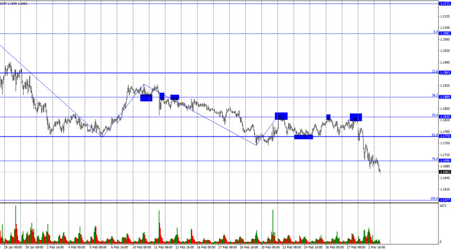 A estrutura de ondas no gráfico horário permanece simples. A última onda de alta concluída não conseguiu romper o topo anterior, enquanto a nova onda de baixa superou com firmeza o fundo precedente. Assim, a tendência continua sendo de baixa. Os touros fizeram uma pausa dentro do que vinha sendo um movimento de alta de maior escala — algo que dificilmente teria ocorrido sem os desdobramentos associados a Donald Trump. No entanto, as ações de Trump no Oriente Médio, que desencadearam operações militares de grande escala envolvendo cerca de uma dúzia de países, passaram agora a sustentar a moeda norte-americana.