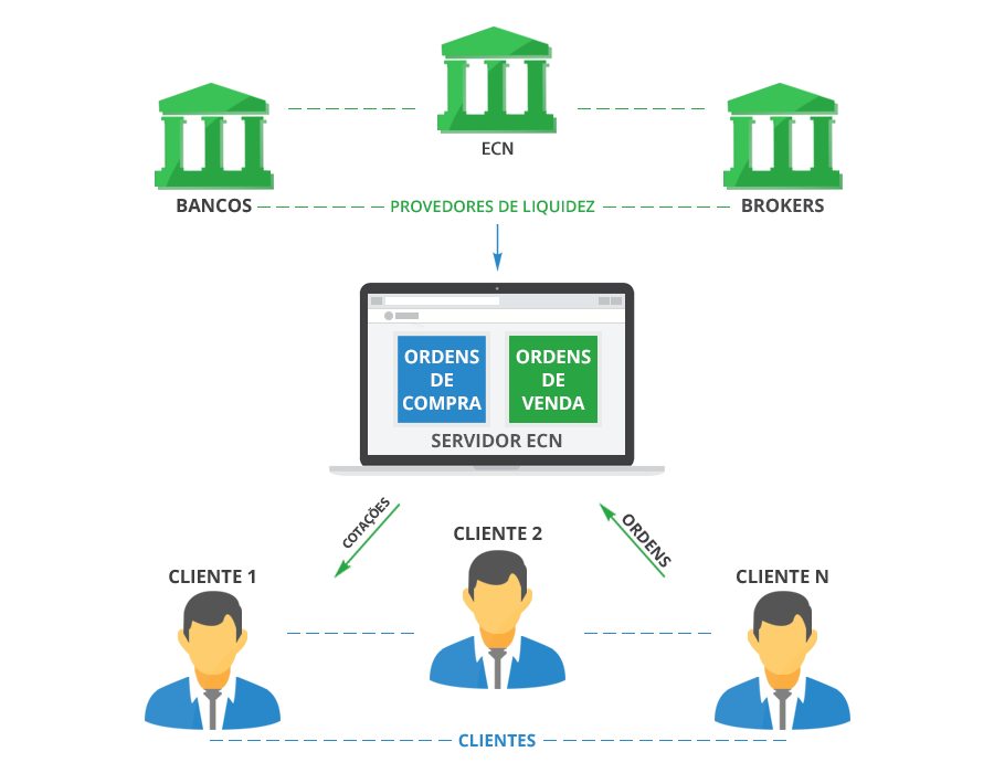 Brokers ECN eliminam a necessidade de mesas intermediárias e otimizamo processo de negociação para uma execução mais rápida e confirmação mais rápida sem requotess.