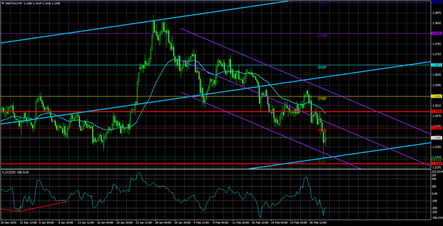 Доллар США в итоге растет уже больше месяца. Вначале он рос на коррекции против сильного обвала в январе-месяце. Затем из Великобритании поступил целый пакет разочаровывающей статистики. После этого в США вышло буквально несколько отчетов, которые могли поддержать доллар, и рынок принял их за чистую монету. Ну а примерно две недели назад обстановка вокруг Ирана начала накаляться, и рынок начал готовиться к новой войне. В итоге, мы видим рост американской валюты, который невозможно было предсказать. Никто не мог месяц назад с уверенностью сказать, что между Ираном и целой группой стран начнется полноценная война. Никто не мог знать, какие результаты покажут ключевые макроэкономические показатели США и Великобритании в феврале. Таким образом, все текущее движение пары GBP/USD на Юг – это результат локальных событий, но никак не общей тенденции, которая, напомним, остается восходящей на всех старших ТФ.